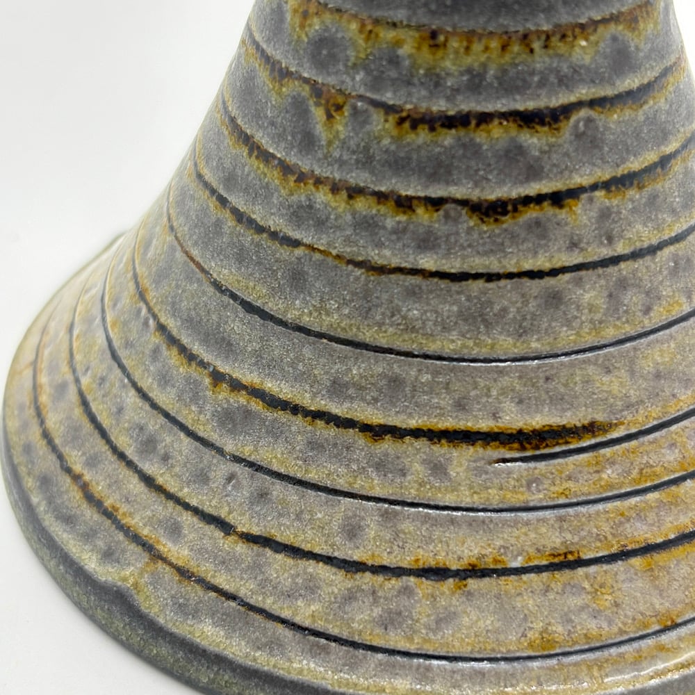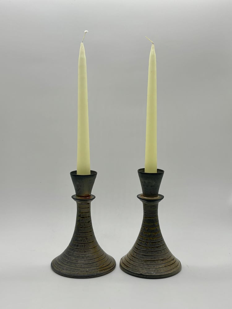 This candle stick holder is made out of a white stoneware/porcelain blend and inlayed with iron oxide. It was fired in a catenary arch kiln for two days in Oregon and soda was added.