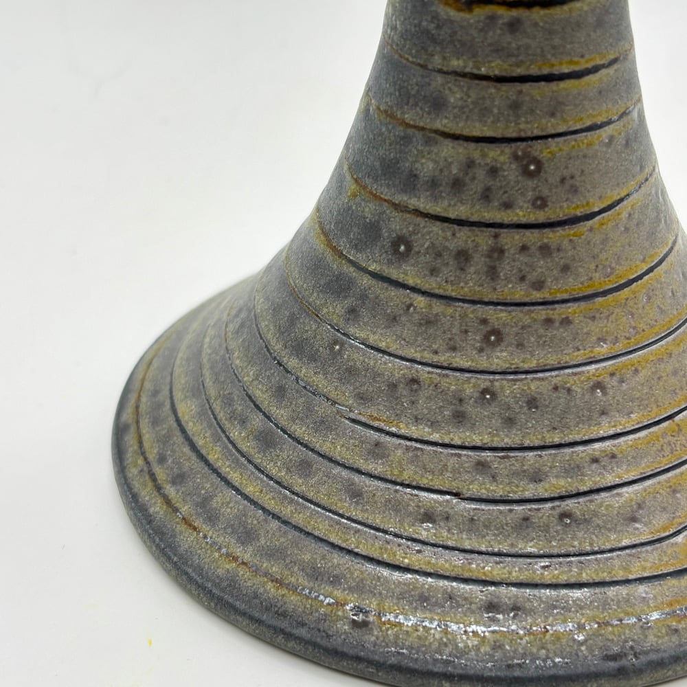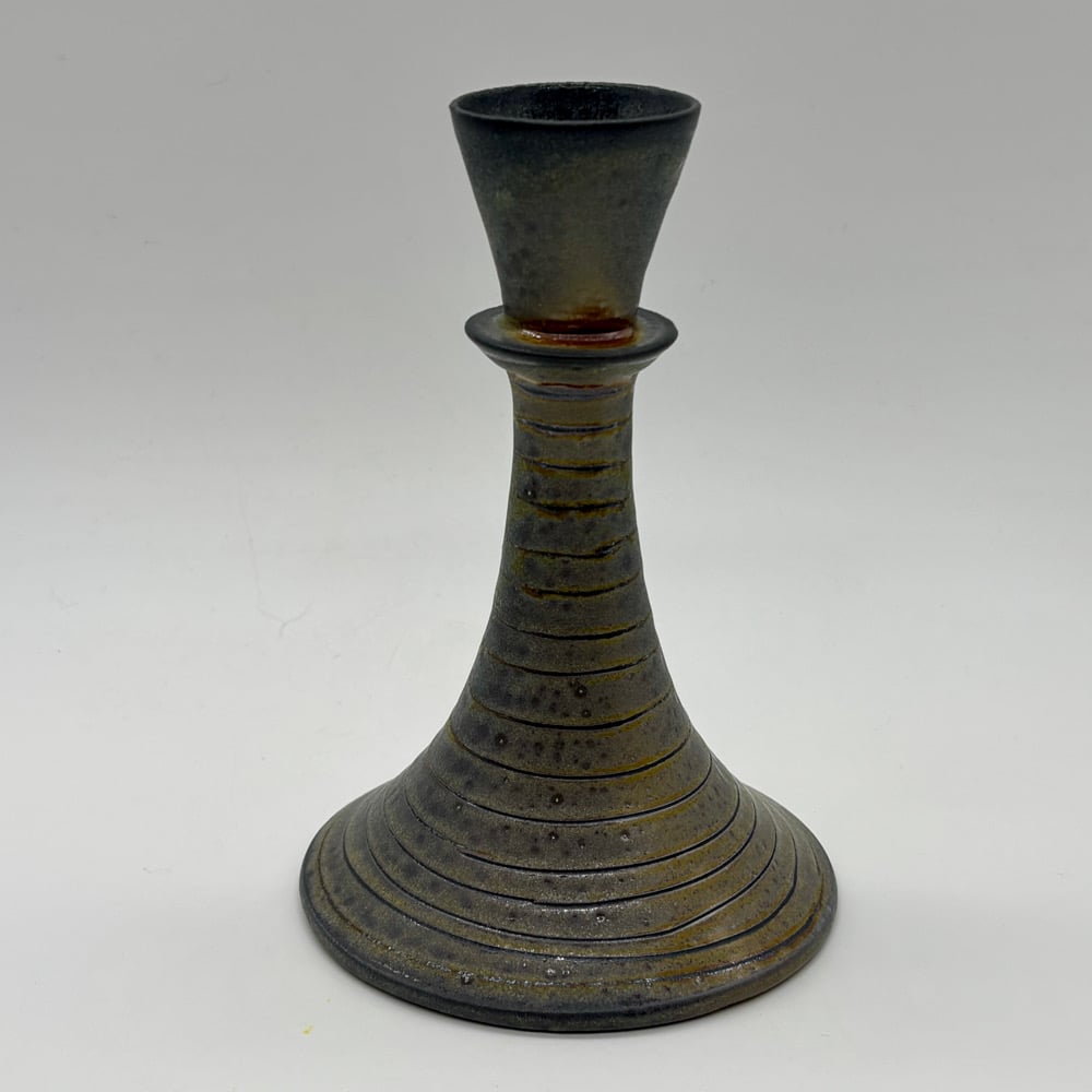 This candle stick holder is made out of a white stoneware/porcelain blend and inlayed with iron oxide. It was fired in a catenary arch kiln for two days in Oregon and soda was added.