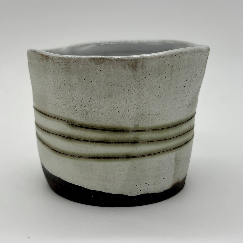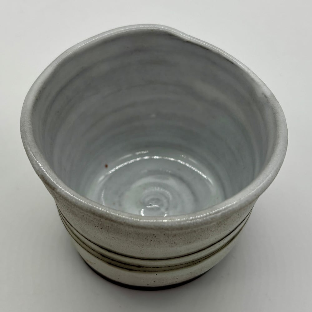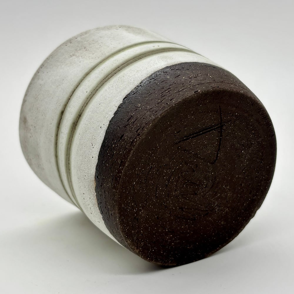 This 3oz cup is made out of a dark stoneware, inlayed with copper carbonate and glazed with a matte white glaze on the outside. There is a durable white liner glaze on the inside.