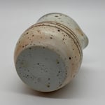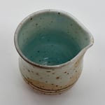 This 8oz pourer is made out of porcelain blended with playground sand. It was inlayed with a black stain and has a durable celadon liner glaze. It was fired in a gas kiln and soda was added.
