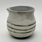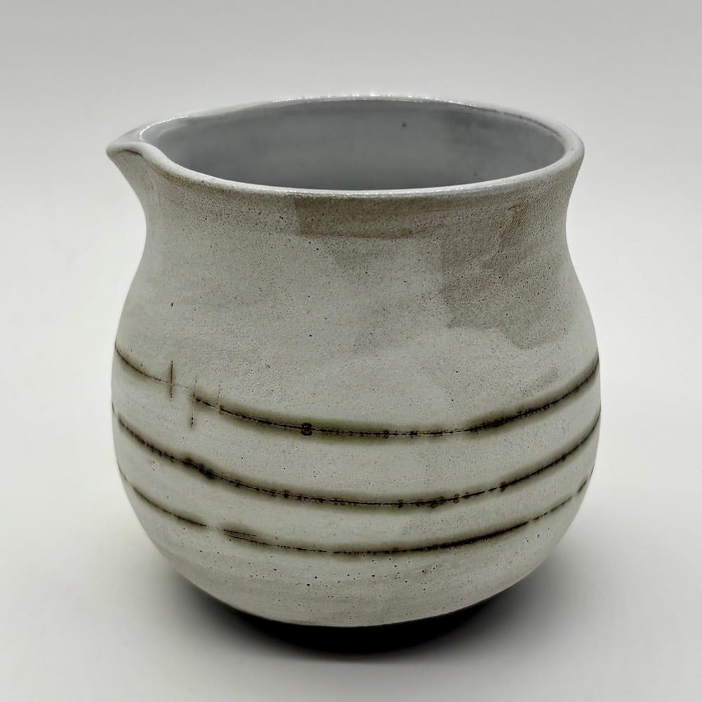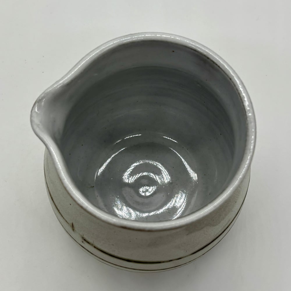 This 10 oz pourer is made out of a dark stoneware, inlayed with copper carbonate and glazed with a matte white glaze on the outside. There is a durable white liner glaze on the inside.