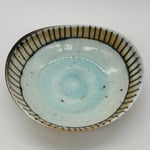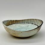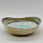 This dish is made out of porcelain blended playground sand. It is inlayed with a black stain and aside from its naturally produced glaze, it has a durable celadon liner glaze. It was fired in a catenary arch kiln in Oregon and soda was added.