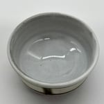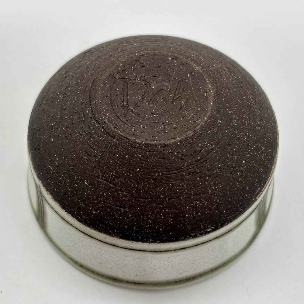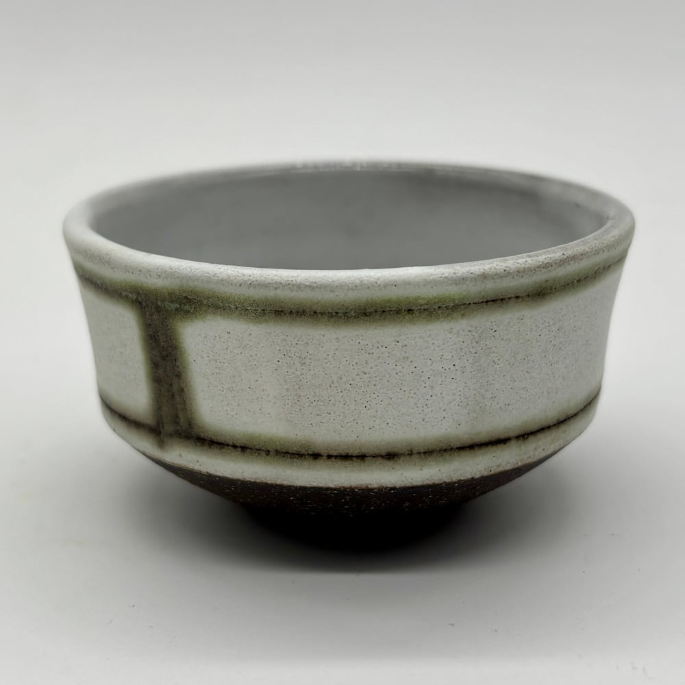 This 2oz cup is made of a dark stoneware clay body. It was inlayed with copper carbonate and glazed with a durable white glaze on the inside and a matte white glaze on the outside.