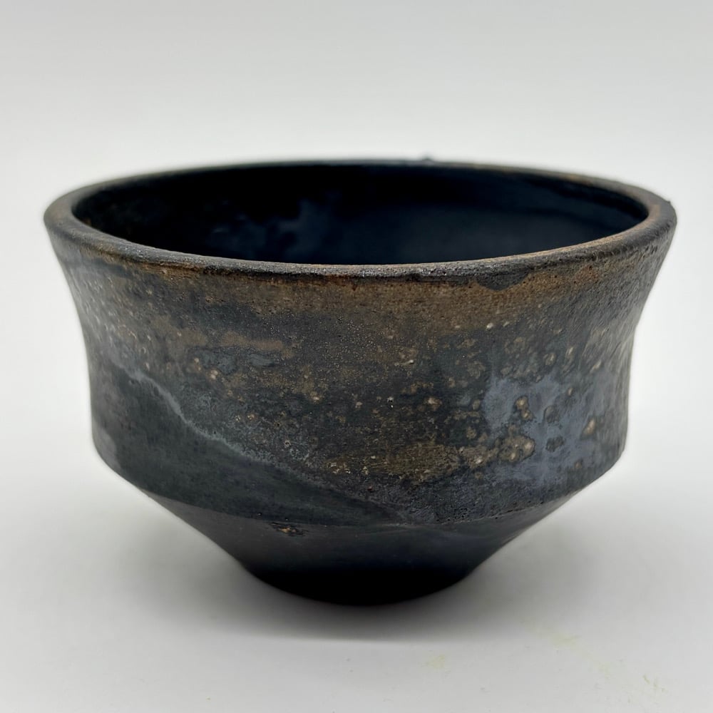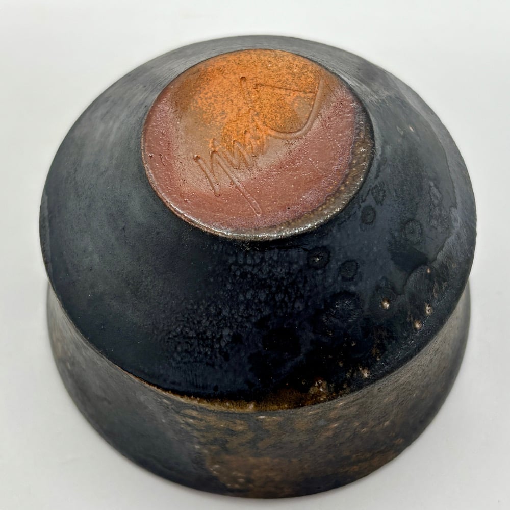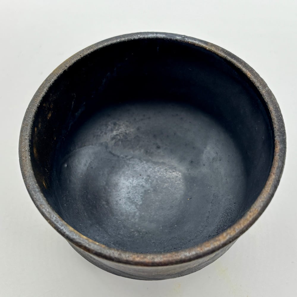 This 4oz cup is made from stoneware and coated with a dark clay body slip. It was fired in a gas kiln and soda was added.