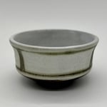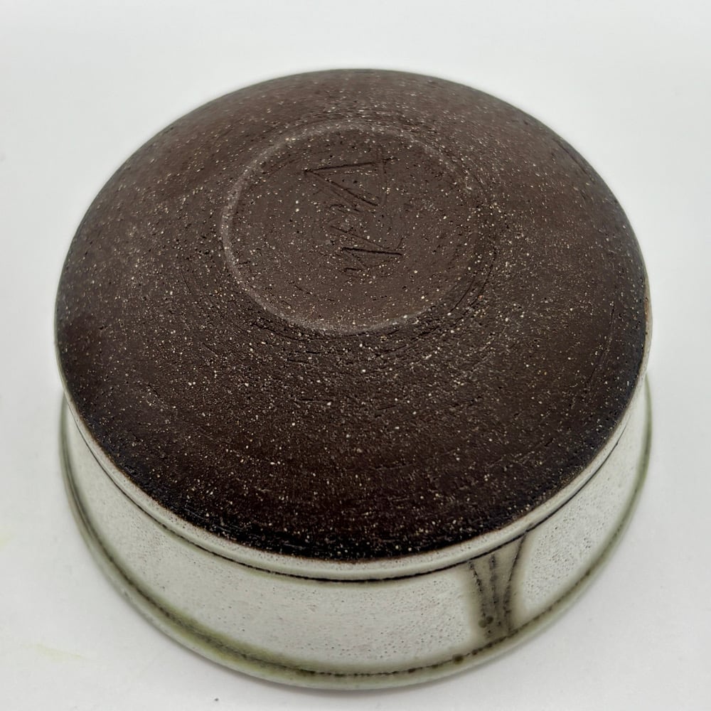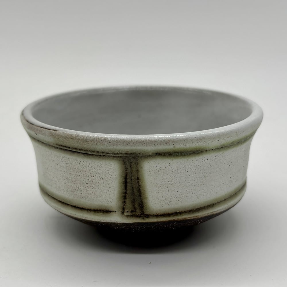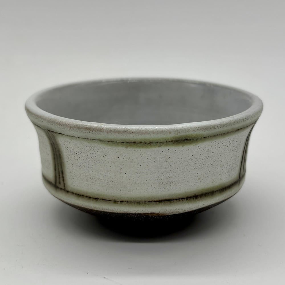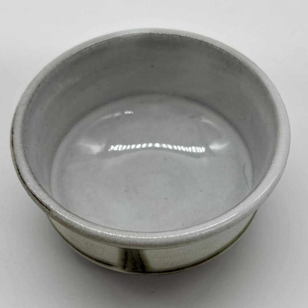 This 2oz cup is made of a dark stoneware clay body. It was inlayed with copper carbonate and glazed with a durable white glaze on the inside and a matte white glaze on the outside.