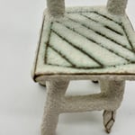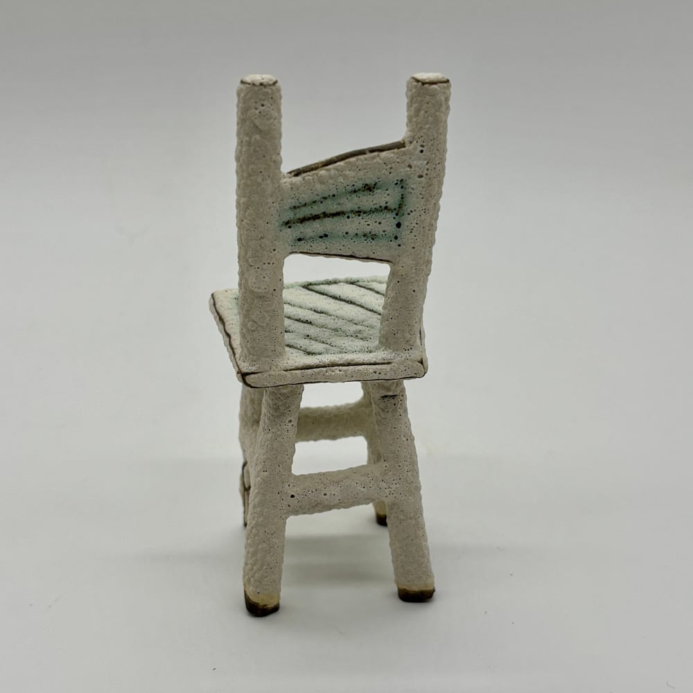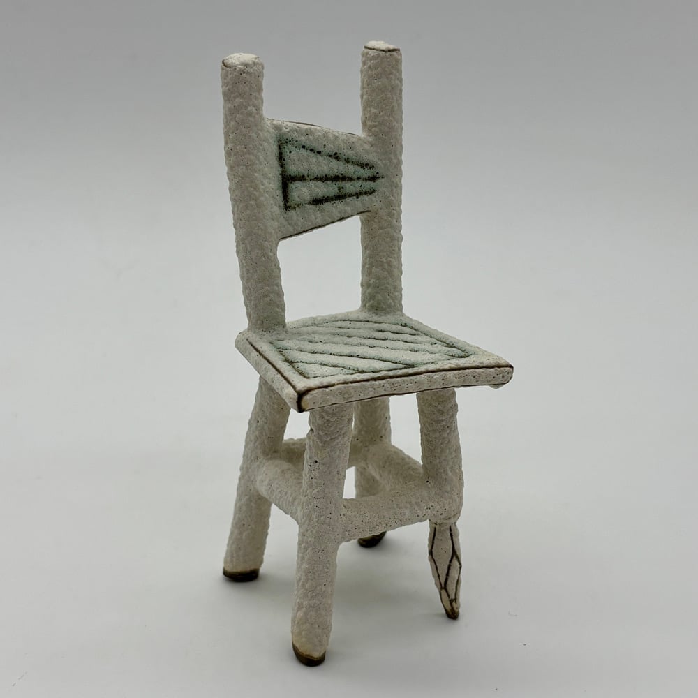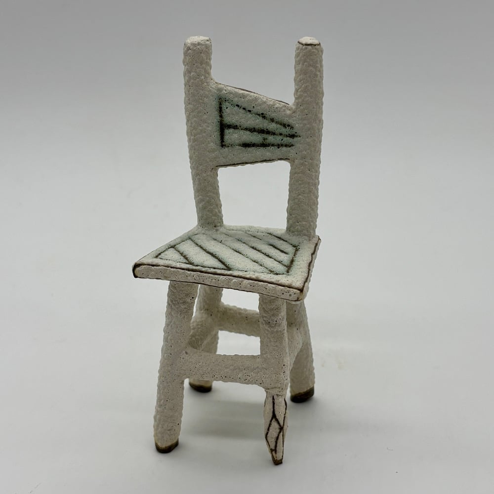 This tiny chair is made out of a dark stoneware, inlayed with copper carbonate and glazed with a matte white lava glaze.