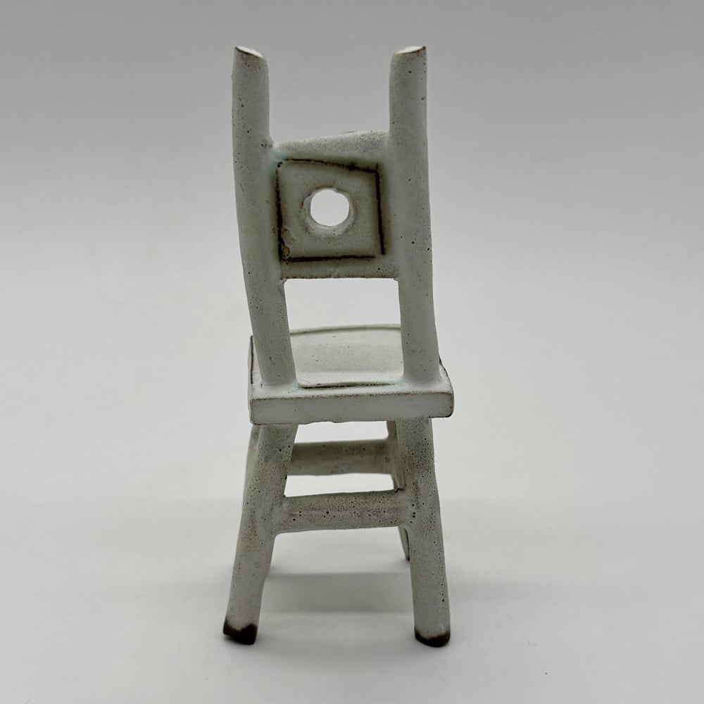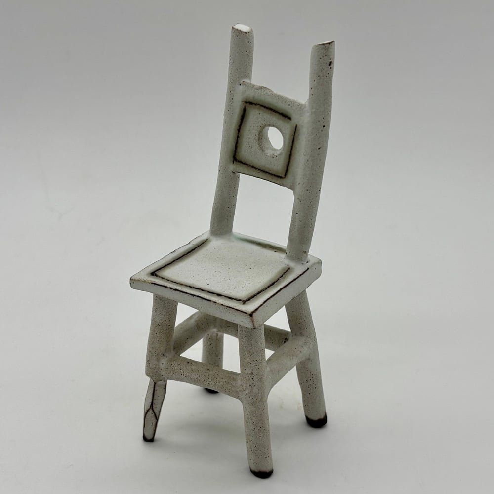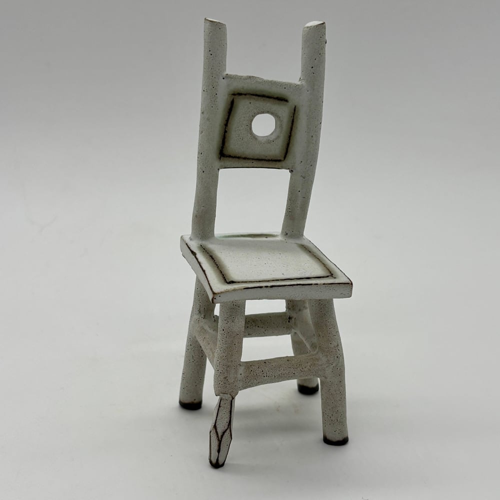 This tiny chair is made out of a dark stoneware, inlayed with copper carbonate and glazed with a matte white glaze.