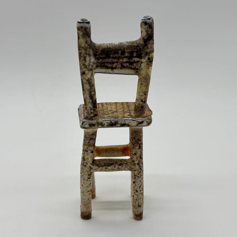 This tiny chair is made out of a white stoneware, porcelain blend, inlayed with iron oxide and glazed with a shino glaze.